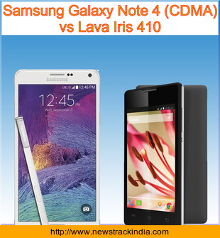 Samsung Galaxy Note 4 (CDMA) is powered with Quad-core 2.7 GHz Krait 450 processor. Whereas Lava Iris 410 comes with Dual-core 1.3 GHz processor.