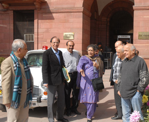 Information and Broadcasting Minister Ambika Soni with film personalities Mahesh Bhatt, Ramesh Sippy and others coming out of Finance Ministry after a meeting with Finance Minister Pranab Mukherjee in New Delhi on Sunday.