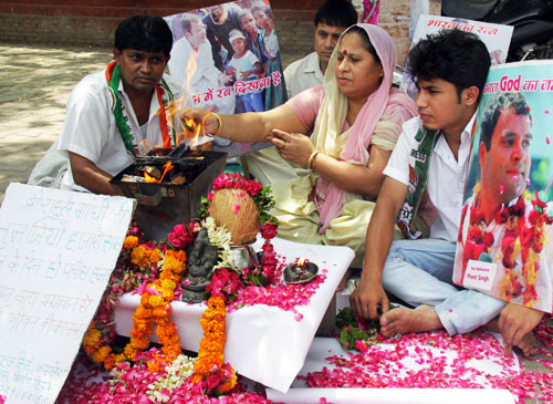 Rahul Gandhi's supporter & fan are performing puja's for long life at a occasion at Front of AICC in New Delhi .