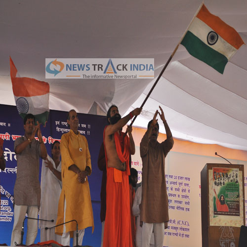 Baba Ramdev waving the national flag to the crowd after his speech at Ramlila Maidan on Thrusday. He motivated the crowd with the feeling of patriotism by holding the tricolor in his hand during his agitation that began from today.