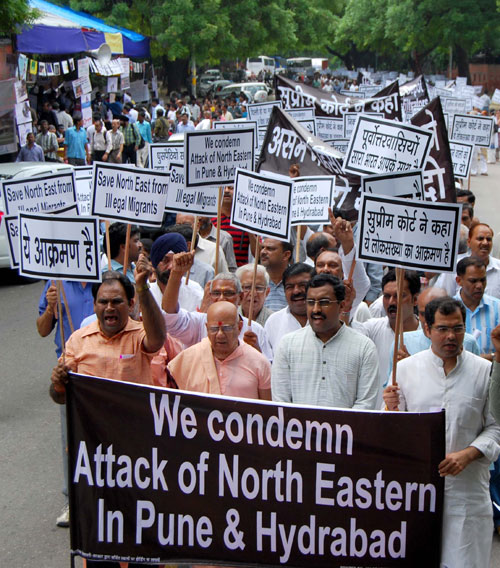RSS supporters protesting in support of North Eastern people who are forced to flee from South Indian cities, after rumors spread that they will be attacked after the Muslim festival EID in retaliation to the Violence in Assam and other North Eastern states.