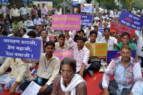 All India equality forum members during a protest against the proposed constitution amendment on the issue of reservation of SC/ST in the promotion at Jantar-Mantar in New Delhi on Sunday.