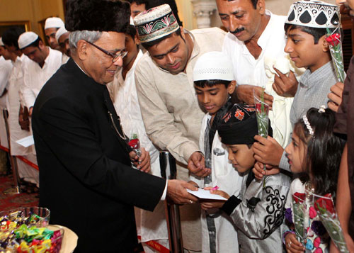 The President of India, Pranab Mukherjee, receiving Id-ul-Fitr greetings from various people at Rashtrapati Bhavan in Capital on Monday.
