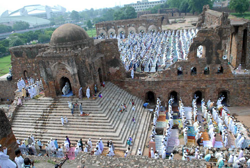Muslim devotees offering Namaz on the occasion of Eid-ul-Fitr at Ferozshah Kotla mosque in New Delhi on Monday