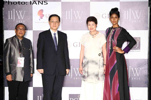 Atul Parekh, Kiyoshi Asako, Yoshie Ishikawa and Carol Gracias pesing for the photographers at the India International Jewellery Week 2012 on Day 3.