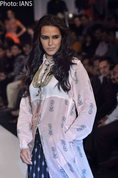Neha Dhupia walked the ramp for Gitanjali Group at India International Jewelry Week 2012 in Mumbai.
