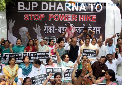 BJP Delhi President Vijay Goel and BJP women workers carried out a protest against DERC Chairman for price hike in electricity in New Delhi on Monday.