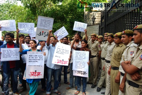 AISA Students carried out a protest outside Shastri Bhawan against a corruption in BCCI and Spot fixing and IPL and demanded CBI inquiry in New Delhi on Monday.