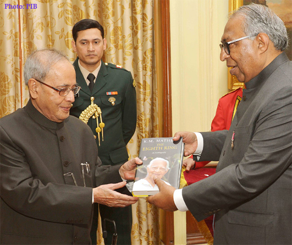 New Delhi on November 26, 2015: The President, Shri Pranab Mukherjee receiving the first copy of the book entitled "8th Ring" from the Executive Editor, Malayala Manorama, Shri Jacob Mathew, at Rashtrapati Bhavan, in New Delhi.