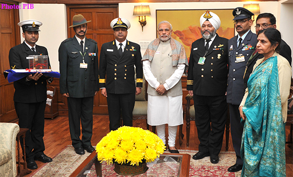 New Delhi on December 07, 2015: The Prime Minister, Shri Narendra Modi with the Officers of the Kendriya Sainik Board, on the occasion of Armed Forces Flag Day, in New Delhi.