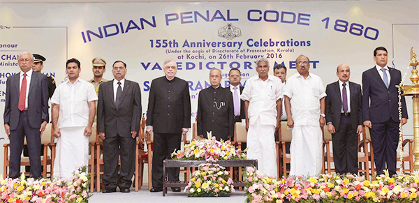 Kerala on February 26, 2016: The President, Shri Pranab Mukherjee at the inauguration of the valedictory function of 155th Anniversary of the Indian Penal Code (IPC) 1860, organised by the Directorate of Prosecution, Kerala, at Kochi, in Kerala. The Chief Minister of Kerala, Shri Oommen Chandy and other dignitaries are also seen.