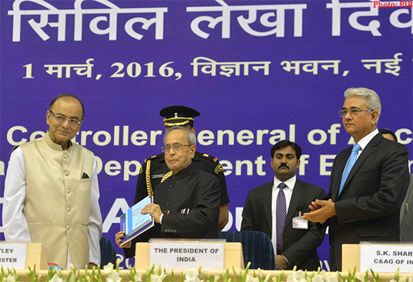 The Union Minister for Finance, Corporate Affairs and Information & Broadcasting, Shri Arun Jaitley released the book on the History of Civil Accounts Organisation and presenting the first copy to the President, Shri Pranab Mukherjee at the 40th Anniversary Celebrations of the Indian Civil Accounts Service, organised by the office of Controller General of Accounts (CGA), in New Delhi on March 01, 2016. The Comptroller & Auditor General of India, Shri Shashi Kant Sharma is also seen.