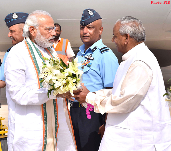 Rajasthan on March 18, 2016: The Prime Minister, Shri Narendra Modi being welcomed by the Governor of Rajasthan, Shri Kalyan Singh, on his arrival, at Jaisalmer Air base, in Rajasthan.
