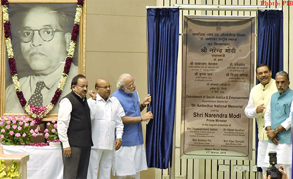 New Delhi on March 21, 2016: The Prime Minister, Shri Narendra Modi laying the foundation stone of the Dr. B.R. Ambedkar National Memorial, in New Delhi. The Union Minister for Social Justice and Empowerment, Shri Thaawar Chand Gehlot, the Union Minister for Science & Technology and Earth Sciences, Dr. Harsh Vardhan and the Ministers of State for Social Justice & Empowerment, Shri Vijay Sampla and Shri Krishan Pal are also seen.