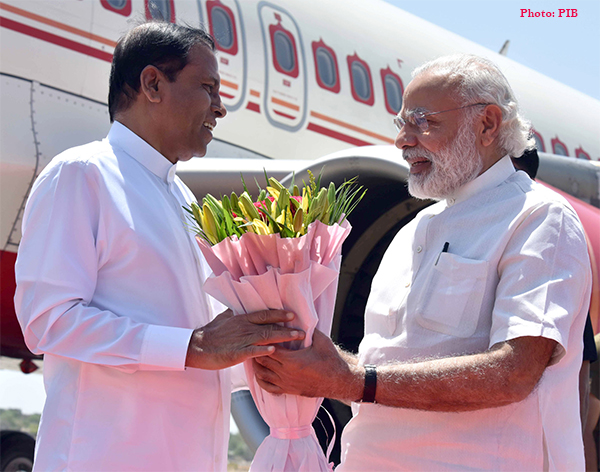 Indore Airport on May 14, 2016: The President of the Democratic Socialist Republic of Sri Lanka, Mr. Maithripala Sirisena being received by the Prime Minister, Shri Narendra Modi, on his arrival at Indore Airport.