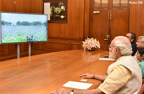 New Delhi on June 18, 2016: The Prime Minister, Shri Narendra Modi witnessing the Yoga Demonstration at the renovated stadium in Jaffna, Sri Lanka, through video conferencing, in New Delhi.