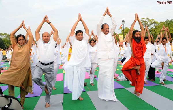New Delhi on June 19, 2016 The Yoga Guru, Baba Ramdev and the Union Minister for Urban Development, Housing and Urban Poverty Alleviation and Parliamentary Affairs, Shri M. Venkaiah Naidu at a yoga camp ahead of the International Day of Yoga - 2016, at Rajpath. The Secretary of AYUSH, Shri Ajit M. Sharan is also seen.