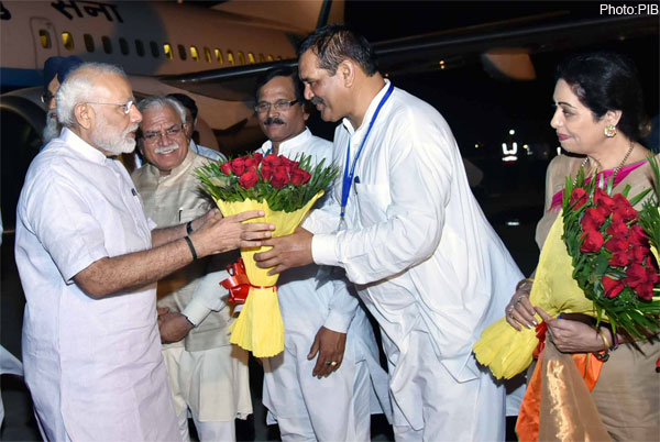 Chandigarh Airport on June 20, 2016 The Prime Minister, Shri Narendra Modi being welcomed by the Chief Minister of Haryana, Shri Manohar Lal Khattar, the Minister of State for AYUSH (Independent Charge) and Health & Family Welfare, Shri Shripad Yesso Naik and the Minister of State for Social Justice & Empowerment, Shri Vijay Sampla, on his arrival at Chandigarh Airport.