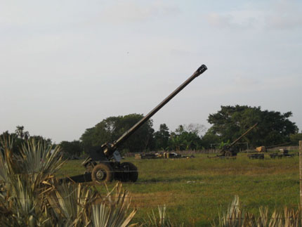 Howitzer artillery guns that once belonged to the Sri Lankan army but were captured by the Tamil Tigers seen in Kilinochchi after the guerrillas withdrew from the town in a hurry following a determined military advance.