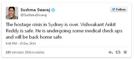 Minister of External Affairs Sushma Swaraj tweeted "The hostage crisis in Sydney is over. Vishwakant Ankit Reddy is safe. He is undergoing some medical check ups and will be back home safe."