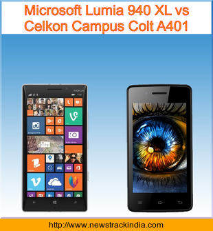 Microsoft Lumia 940 XL is powered with Quad-core 1.5 GHz Cortex-A53 & Quad-core 2 GHz Cortex-A57 processor. Whereas Celkon Campus Colt A401 comes with 1 GHz processor.