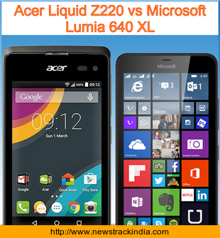 The mobile device Acer Liquid Z220 runs on Android OS, v5.0.x (Lollipop). Whereas Microsoft Lumia 640 XL runs on Microsoft Windows Phone 8.1 with Lumia Denim.
