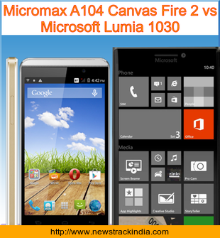 Micromax A104 Canvas Fire 2 is powered with Quad-core 1.3 GHz processor. Whereas Microsoft Lumia 1030 comes with Quad-core processor.