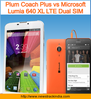 The mobile device Plum Coach Plus runs on Android OS, v4.2.2 (Jelly Bean). Whereas Microsoft Lumia 640 XL LTE Dual SIM runs on Microsoft Windows Phone 8.1 with Lumia Denim.