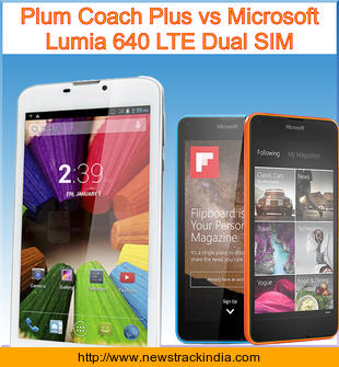 The mobile device Plum Coach Plus runs on Android OS, v4.2.2 (Jelly Bean). Whereas Microsoft Lumia 640 LTE Dual SIM runs on Microsoft Windows Phone 8.1 with Lumia Denim.