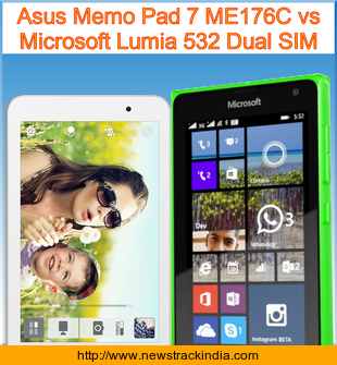 Here we are taking about comparison of the features and specification of the devices Asus Memo Pad 7 ME176C and Microsoft Lumia 532 Dual SIM. Asus Memo Pad 7 ME176C device comes with Non-removable Li-Po (15 Wh) battery. This phone is powered with Quad-core 1.86 GHz processor which gives maximum performance. While Microsoft Lumia 532 Dual SIM device comes with Li-Ion 1560 mAh battery. This device is powered with Quad-core 1.2 GHz Cortex-A7 processor which gives maximum performance.
