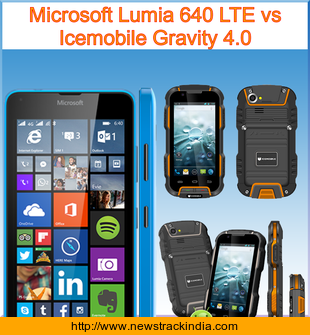 The mobile device Microsoft Lumia 640 LTE runs on Microsoft Windows Phone 8.1 with Lumia Denim. Whereas Icemobile Gravity 4.0 runs on Android OS, v4.4.2 (KitKat).