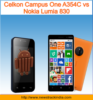 The mobile device Celkon Campus One A354C runs on Android OS, v4.4 (KitKat). Whereas Nokia Lumia 830 runs on Microsoft Windows Phone 8.1.