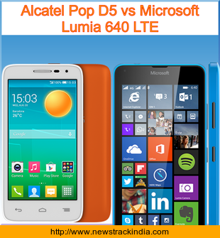 The mobile device Alcatel Pop D5 runs on Android OS, v4.4.2 (KitKat). Whereas Microsoft Lumia 640 LTE runs on Microsoft Windows Phone 8.1 with Lumia Denim.