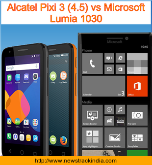 The mobile device Alcatel Pixi 3 (4.5) runs on Android OS, v4.4.2 (KitKat). Whereas Microsoft Lumia 1030 runs on Microsoft Windows 10.