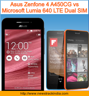 The mobile device Asus Zenfone 4 A450CG runs on Android OS, v4.4.2 (KitKat). Whereas Microsoft Lumia 640 LTE Dual SIM runs on Microsoft Windows Phone 8.1 with Lumia Denim.