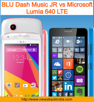 The mobile device BLU Dash Music JR runs on Android OS, v4.4.2 (KitKat). Whereas Microsoft Lumia 640 LTE runs on Microsoft Windows Phone 8.1 with Lumia Denim.