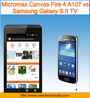 Micromax Canvas Fire 4 A107 is powered with Quad-core 1.3 GHz Cortex-A7 processor. Whereas Samsung Galaxy S II TV comes with Dual-core 1 GHz processor.
