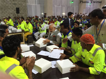 After concluding his address, the Prime Minister moved from table to table, interacting with groups of workers, and sat down to share a meal with some of them.