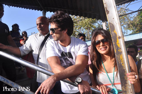 In a way to promote their upcoming film Shahid and Priyanka along with Kunal Kohli took a ride in the local train of Mumbai from Marine Lines station to reach Jai Hind College in Churchgate.