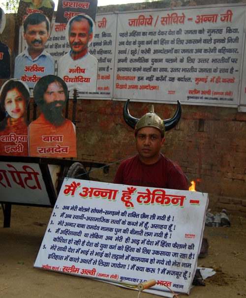 Social worker Salim Alwi's demonstration at Jantar Mantar against a Anna Hazare team in New Delhi .