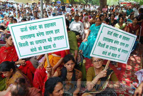 Women shouting slogans during a dharna in support of Uttarakhand Water Resources Minister Mantri Prasad Naithani who began indefinite fast seeking early completion of the 330 MW Srinagar hydel project in the state, at Jantar-Mantar in New Delhi on Tuesday.