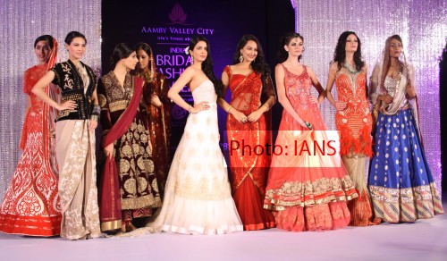 Sonakshi Sinha and other models posing during the press conference of the Aamby Valley India Bridal Fashion Week 2012 held in New Delhi on Tuesday.