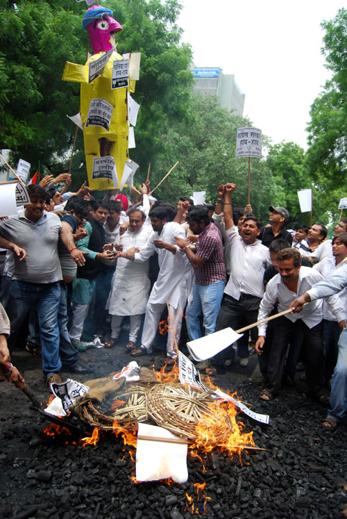 Bhartiya Janta Party yuva morcha burned effigy of Prime minister on issue of coal scam at Jantar Mantar in New Delhi.
