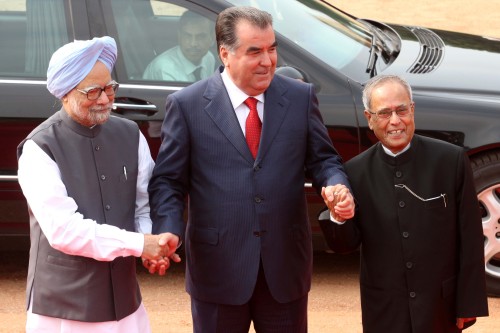 President Pranab Mukherjee with Prime Minister Manmohan Singh received Tajikistan President Emomali Rahmon at Rashtrapati Bhavan in New Delhi on Monday.