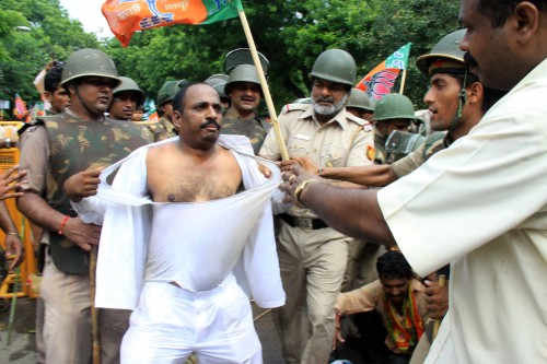 Supporters of BJP Andhra Pradesh unit during a protest in New Delhi on Tuesday as police stopped them at Parliament street demanding for separate Telangana state.