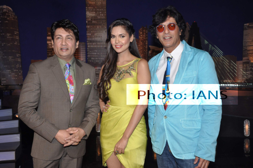 Esha Gupta posing with Shekhar Suman and Chunky Pandey on the sets of Laugh India Laugh at Andheri, Mumbai.