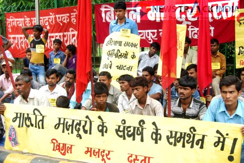 Maruti workers carried out a protest at Jantar Mantar, New Delhi on Thursday against Haryana Govt.