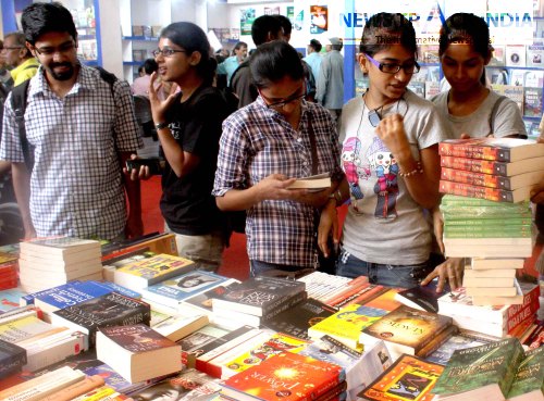 Women and student look for books in a stall at 19th Delhi Book Fair at Pragati Madain in New Delhi on Tuesday.