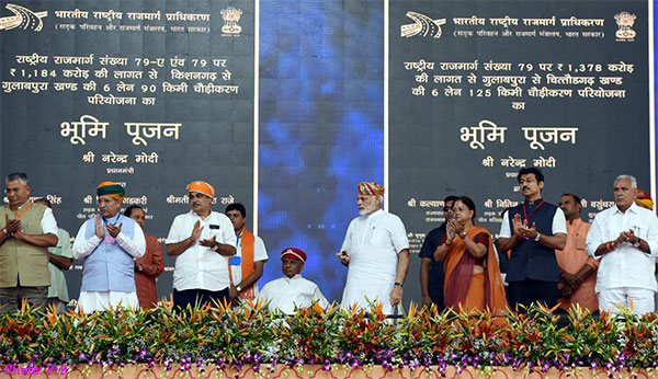 Rajasthan on August 29, 2017: The Prime Minister, Shri Narendra Modi inaugurating and laying the foundation stone of several major highway projects, at Udaipur, in Rajasthan. The Governor of Rajasthan, Shri Kalyan Singh, the Union Minister for Road Transport & Highways and Shipping, Shri Nitin Gadkari, the Chief Minister of Rajasthan, Smt. Vasundhara Raje Scindia, the Minister of State for Finance and Corporate Affairs, Shri Arjun Ram Meghwal, the Minister of State for Electronics & Information Technology and Law & Justice, Shri P.P. Chaudhary, the Minister of State for Consumer Affairs, Food and Public Distribution, Shri C.R. Chaudhary and the Minister of State for Information & Broadcasting, Col. Rajyavardhan Singh Rathore are also seen.