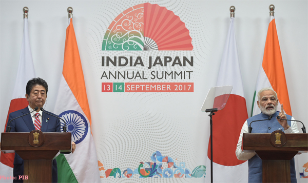 Gujarat on September 14, 2017: The Prime Minister, Narendra Modi and the Prime Minister of Japan, Mr. Shinzo Abe at the joint press statement, during 12th India Japan Annual Summit, at Mahatma Mandir, in Gandhinagar, Gujarat.